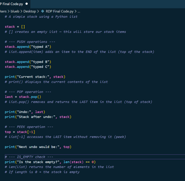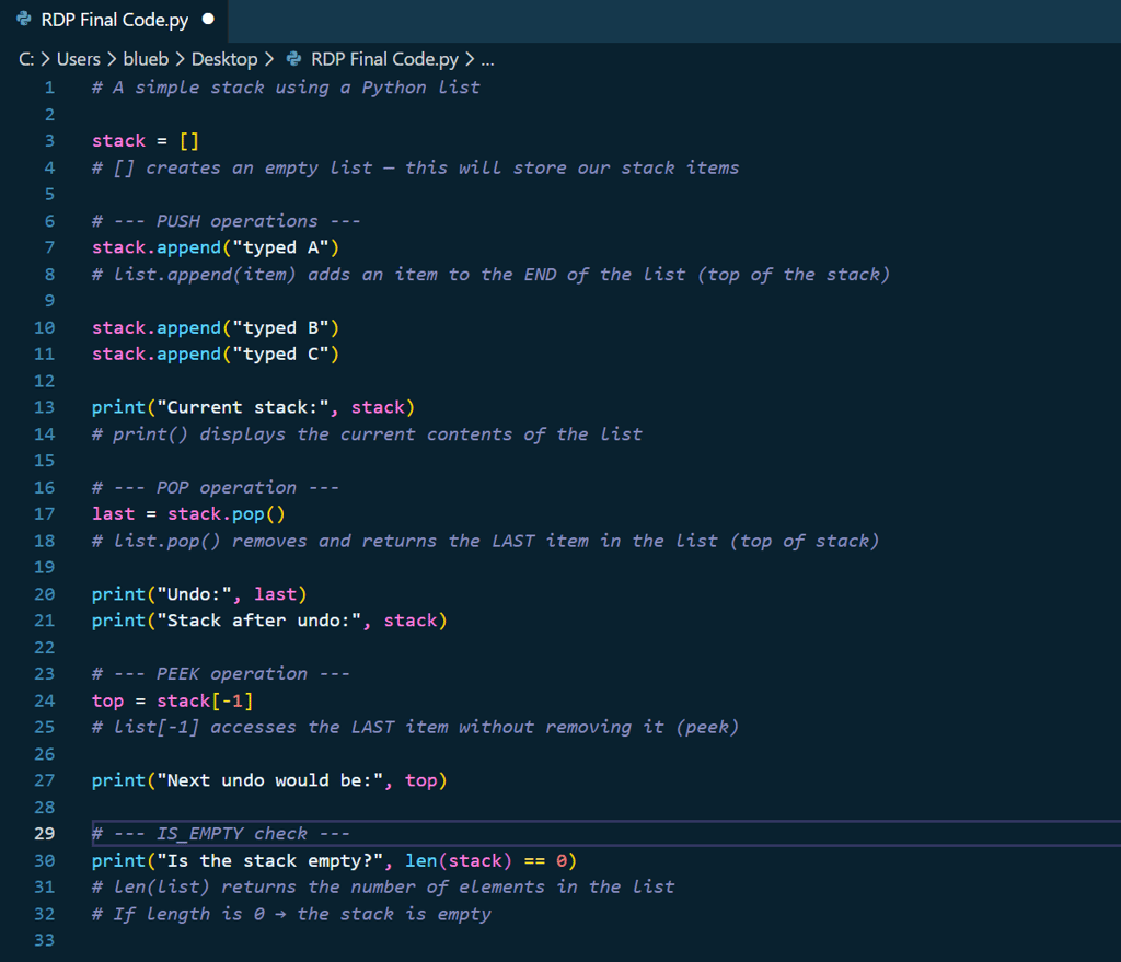 Every stack operation in Python maps to a simple list operation — append, pop, indexing, and len(). That’s how Python turns a list into a stack